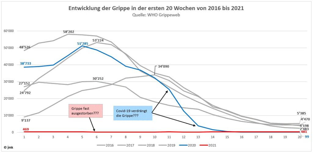 Seit 2020 und dem Auftauchen von Covid-19 ca. ab den Wochen 11-12 ist nichts mehr, wie es einmal war. Dieser neuartige Corona-Virus (SARS-CoV2?) hat, wenn man den verfügbaren Daten glaubt, die Grippe ab der Woche 15/2020 fast vollständig verdrängt. Dieser Trend war dann im ganzen Rest des Jahres 2020 ersichtlich und hält auch 2021 unvermindert an.